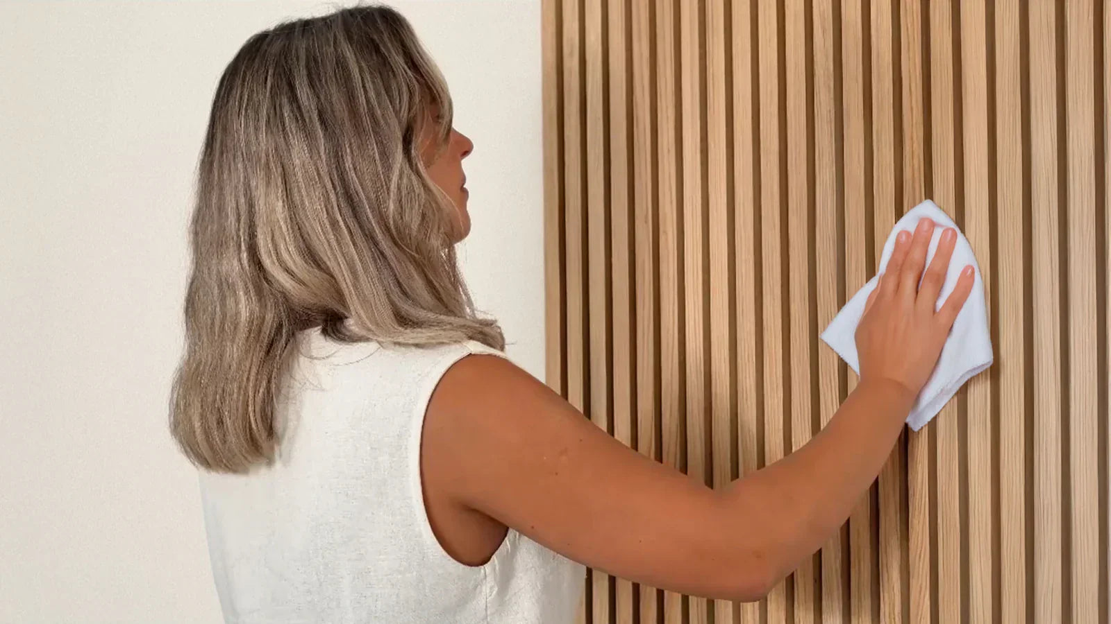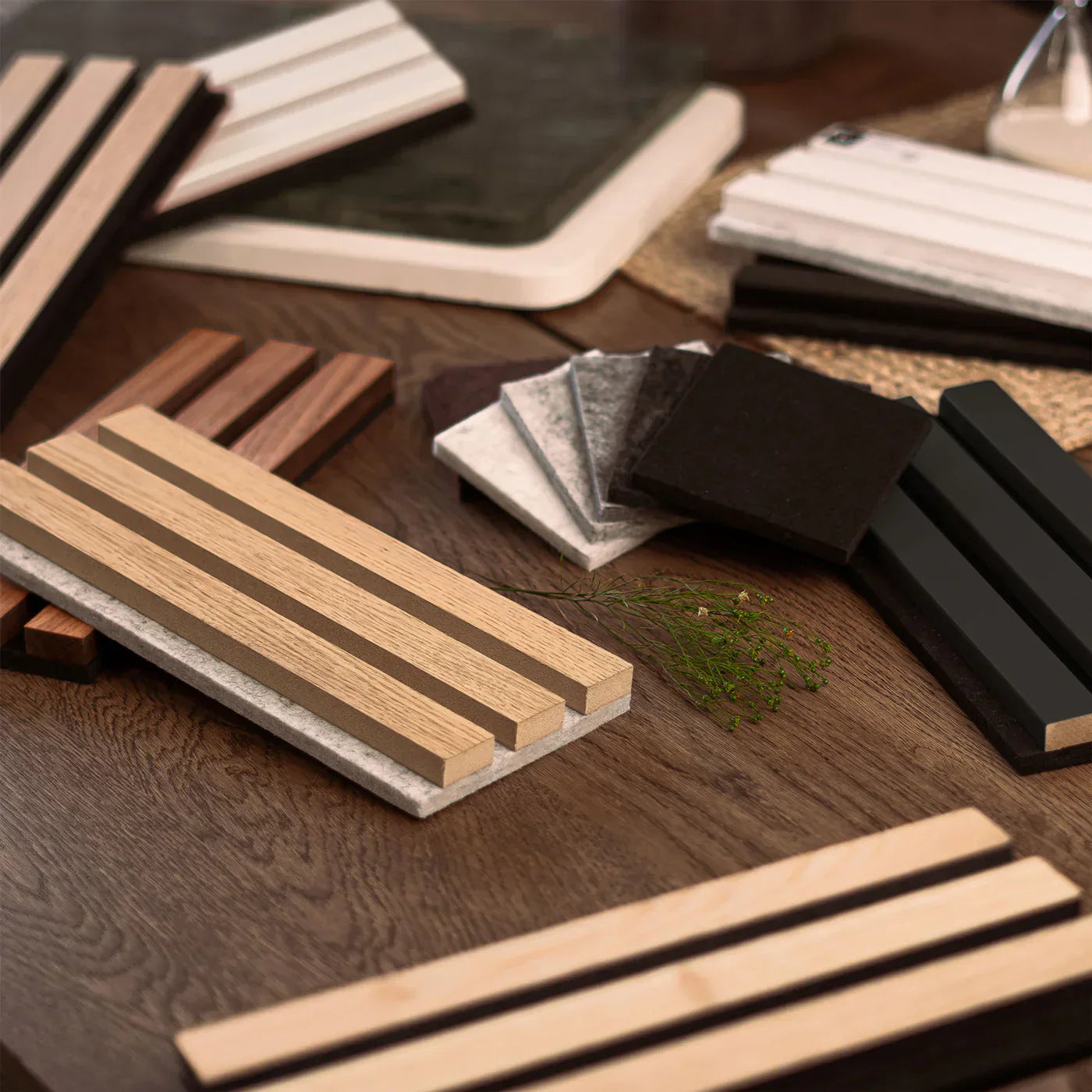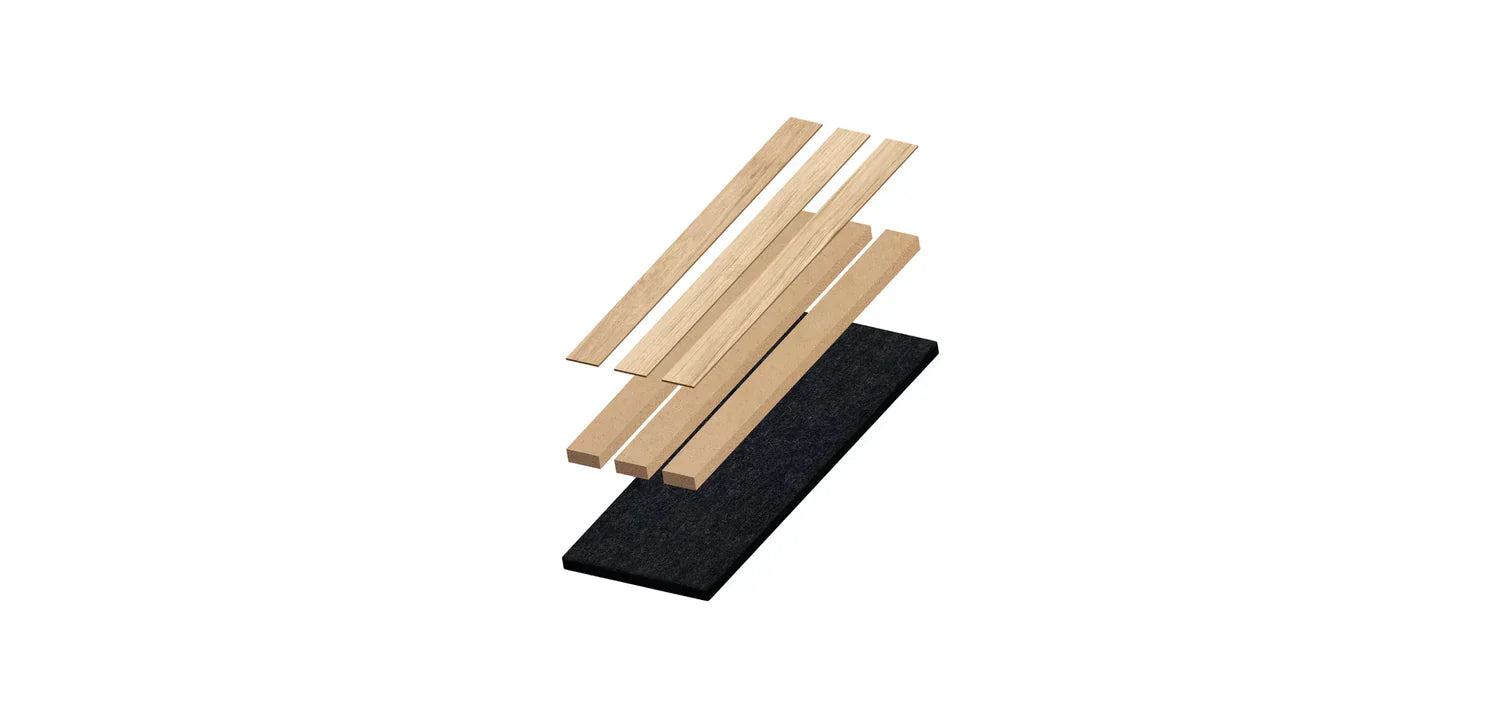 Het Morada lamelenpaneel combineert lagen natuurlijk houtfineer, MDF en gerecycled akoestisch vilt, wat zorgt voor esthetiek, functionaliteit en duurzaamheid in elk detail.